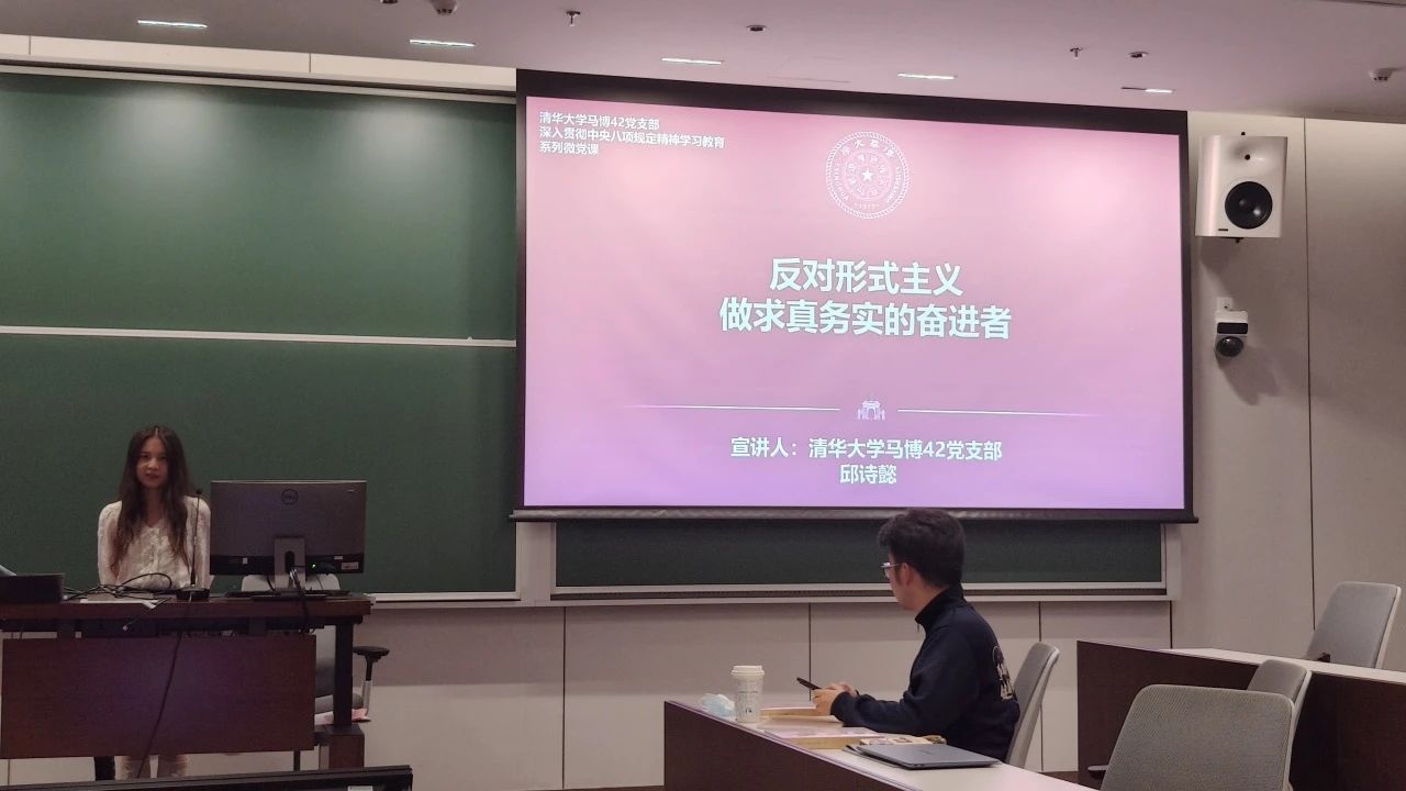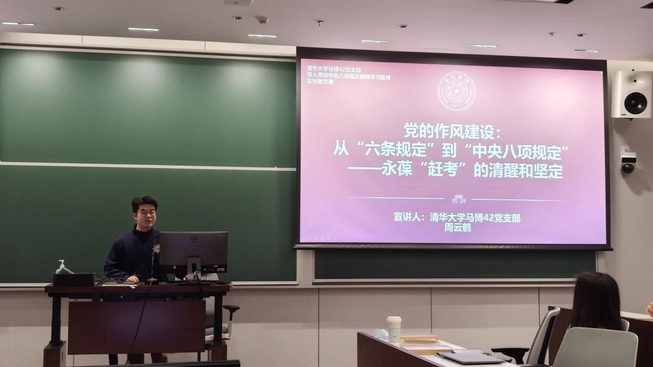 为开展深入贯彻中央八项规定精神学习教育,清华大学马克思主义学院马博42党支部书记、理论报告团讲师周云鹤带来专题讲座《从西柏坡“六条规定”到党的作风建设》,结合百年党史深入阐述作风建设对青年党员成长成才的重要意义。讲师邱诗懿则以《做求真务实的奋进者》为题,引导与会党员坚守初心、追求真理,在科研一线书写青春答卷。best365英国体育在线国重支部副书记王乐宁分享了支部在推动“党建+科研”融合方面的实践经验,特别是如何发挥党建导航灯、科研实践场作用,通过支部建设激发青年科技人才的凝聚力与战斗力,真正汇聚起青年创新力量的思考与做法。