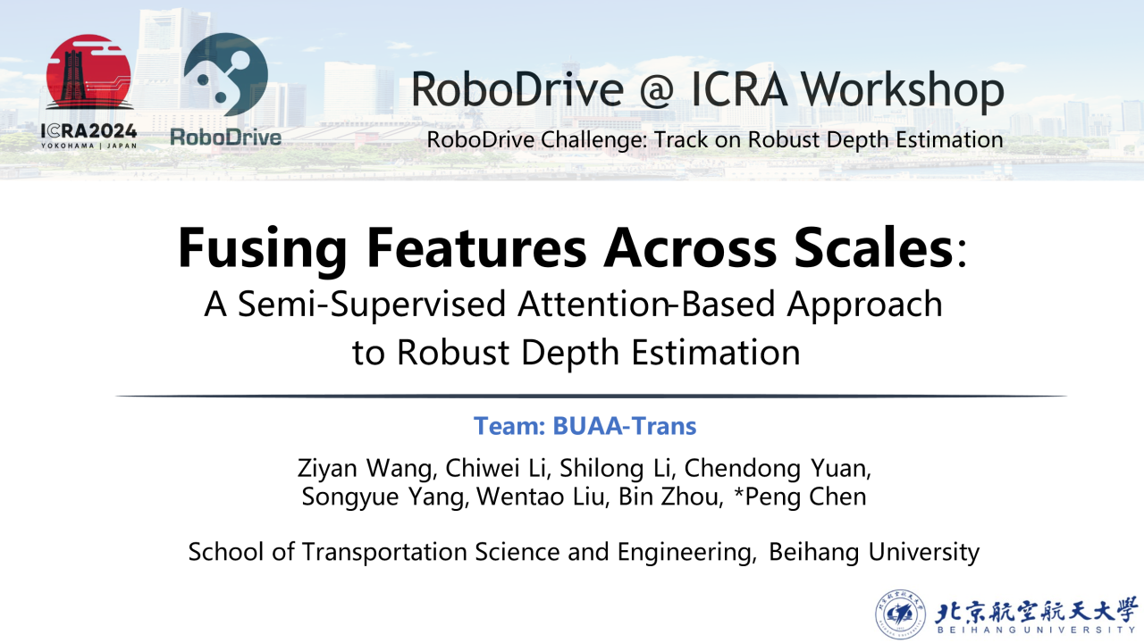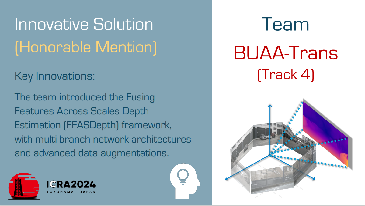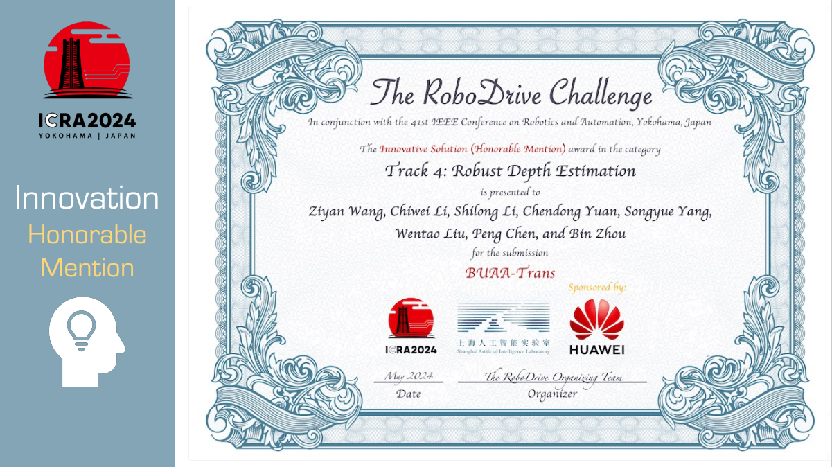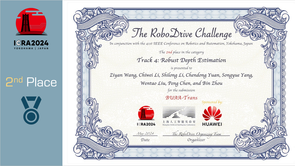 由best365英国体育在线无人驾驶运输团队陈鹏老师和周彬老师指导,best365英国体育在线硕士生王子岩、袁晨栋、李世龙,博士生杨松岳、刘文韬,生物与医学工程学院硕士生李持惟组成的“BUAATRANS”团队获得鲁棒深度估计赛道亚军和比赛创新奖提名。