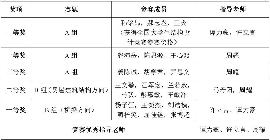 本届竞赛共有三组赛题:A组:考虑水平振动的高耸塔式结构设计与模型制作;B组(房屋建筑结构方向):京津冀协同发展十周年展览中心设计;B组(桥梁方向):氢能产业园区慢行景观桥。经过激烈的角逐,北航五支参赛队共取得了一等奖三项,二等奖一项,三等奖一项。best365英国体育在线谭力豪、许立言、周耀获评竞赛优秀指导老师。