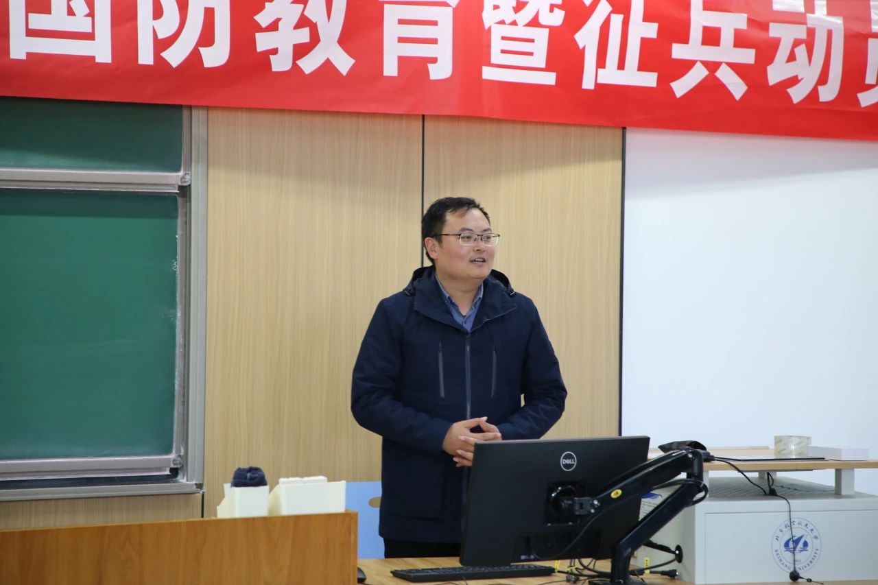 王现首先进行了国防安全教育,他为同学们介绍了习近平强军思想的主要内容,强调关心国防安全是每一位公民的责任,投身国防相关事业是北航青年学生的光荣选择,鼓励大家传承军民“双拥”优良传统,把关心国防安全融入到个人日常学习生活之中。