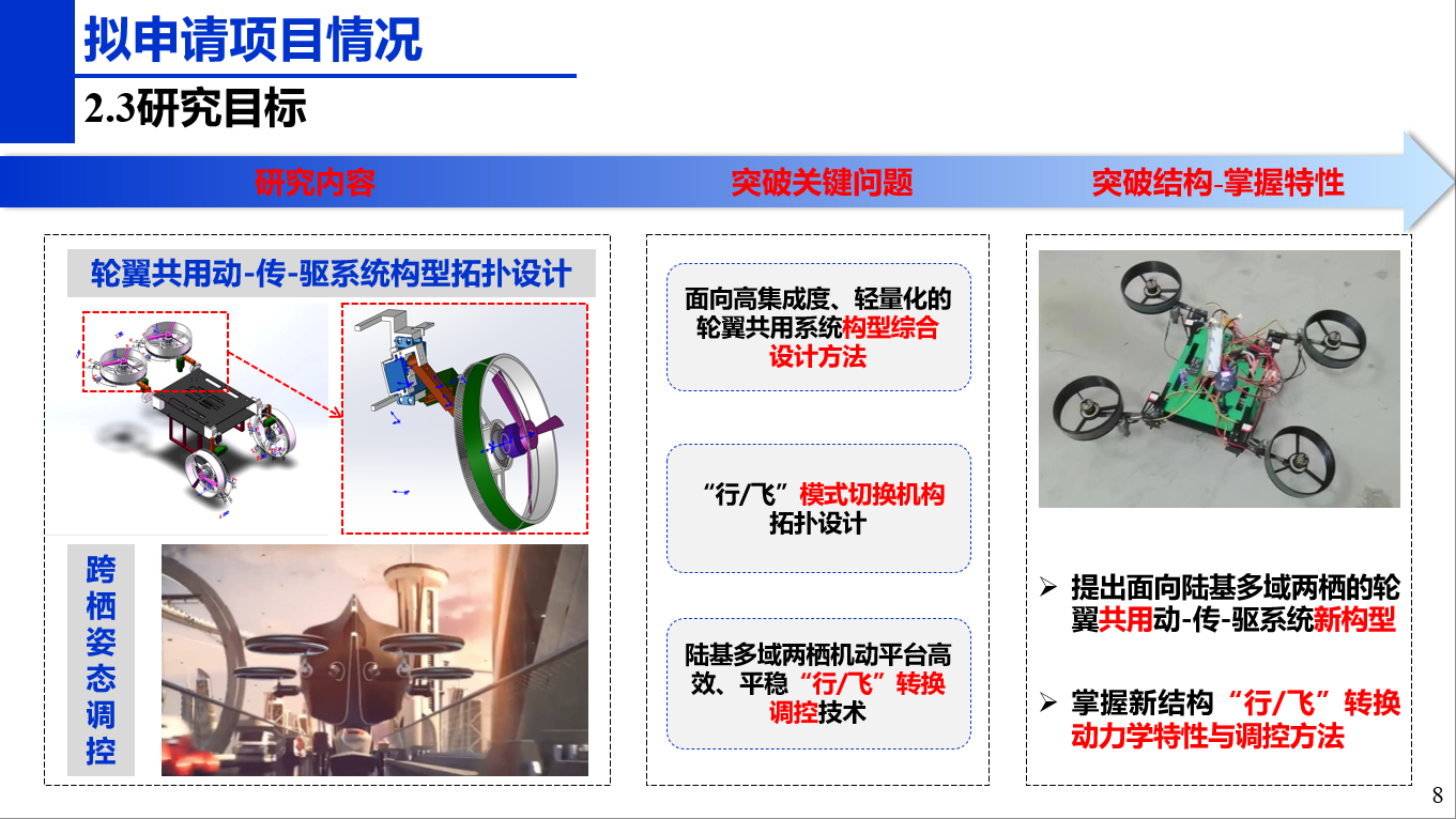 陆空两栖机动平台能够完成不同空间维度的作业任务,已成为国家重点战略需求方向。目前采用轮翼分离结构的陆空两栖机动平台结构冗杂、集成度低、质量过重,至今仍无成熟的解决方案对陆空两栖机动平台的结构、控制优化进行指导。本申请拟通过理论分析、物理建模和仿真模拟,针对地面、低空、近岸、地下管廊等陆空两栖应用场景,完成轮翼共用系统构型拓扑设计,提出“行/飞”模式切换过程控制方法:通过轮翼共用系统构型综合与总成参数匹配,进行轮翼共用系统构型拓扑设计;提出“行/飞”模式切换机构拓扑设计与单轮翼、多轮翼模式切换过程控制方法,研究“行/飞”模式切换机构设计与高效转换过程控制。本项目研究成果可为陆空两栖机动平台构型设计与“行/飞”模式切换过程控制方法提供新思路,并将有效支撑并促进陆空两栖机动平台在军民领域广泛应用。