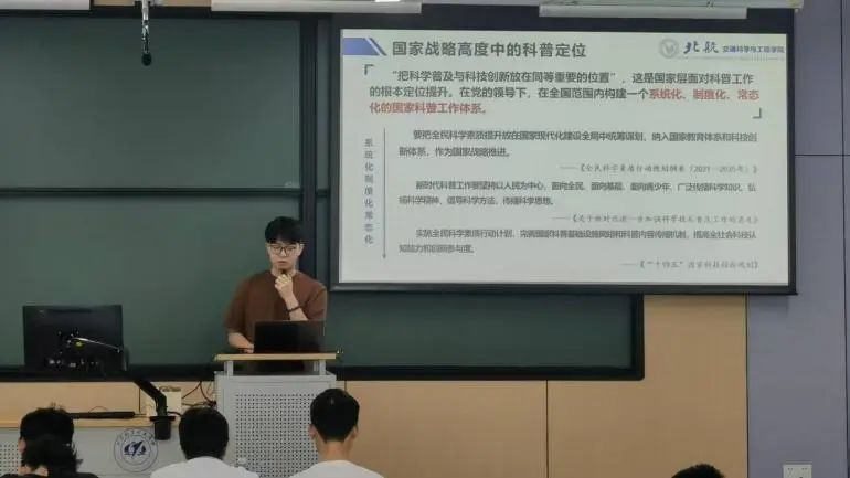 为深入学习贯彻2025年全国两会精神,引导青年学子把握时代脉搏、勇担时代使命,4月23日下午,best365英国体育在线“交通新语”宣讲团在沙河校区二号楼104开展2025年全国两会精神专题宣讲活动。5位学生讲师紧扣两会热词,通过政策解析与案例剖析,从青年担当、科技创新、汽车强国、科学普及、民族团结五个维度展开宣讲。
